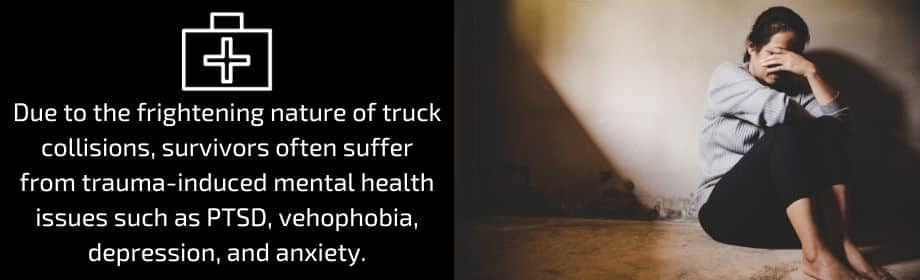 Truck accidents can be violent and terrifying. They are more likely to result in severe injuries and fatalities than a car crash. Due to the frightening nature of truck collisions, survivors often suffer from trauma-induced mental health issues such as PTSD, vehophobia, depression, and anxiety.