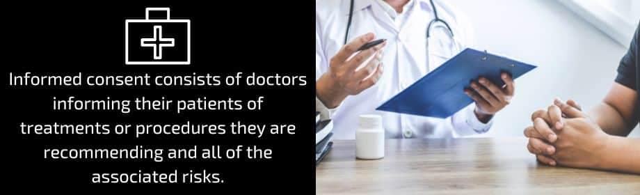 Informed consent consists of doctors informing their patients of treatments or procedures they are recommending and all of the associated risks. This gives the patient the option to weigh the risks and determine whether or not to move forward with the treatment.