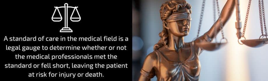 A violation of a standard of care must be proven. Negligence can be established if it is shown that the standard of care was not met. A standard of care in the medical field is a legal gauge to determine whether or not the medical professionals met the standard or fell short, leaving the patient at risk for injury or death.